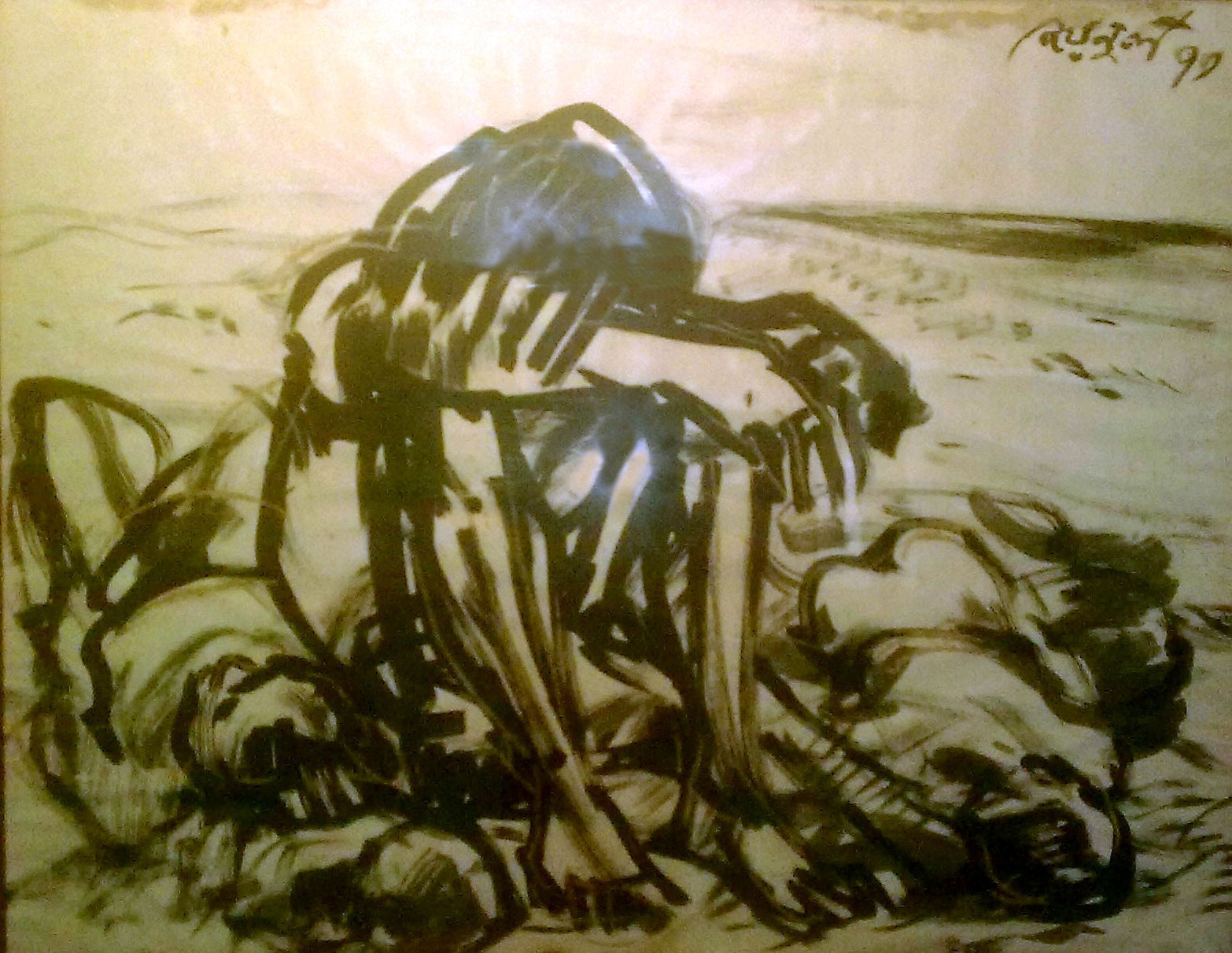 The artwork “Mother and Child” epitomizes his ability to portray universal emotions through a uniquely Bengali lens. With simplified yet powerful forms, the piece conveys tenderness, resilience, and the eternal bond between mother and child—a recurring symbol of sacrifice and love in his oeuvre.